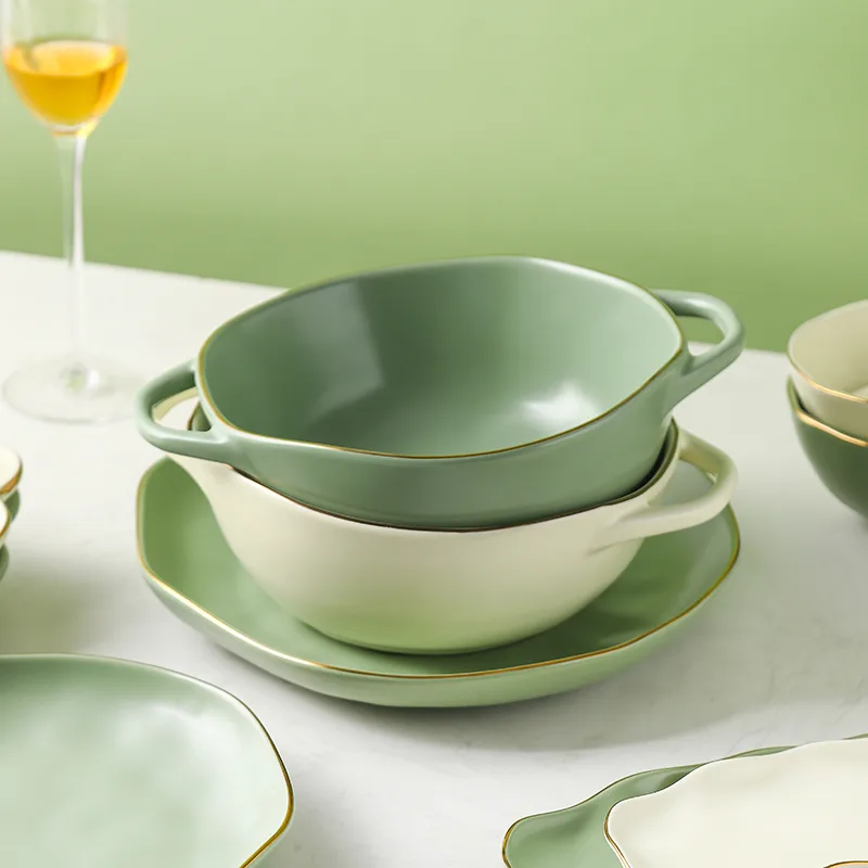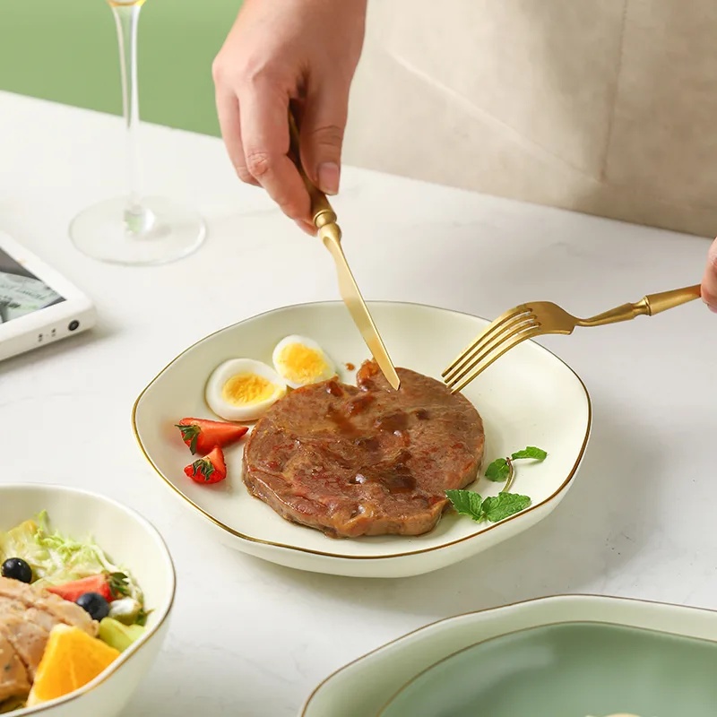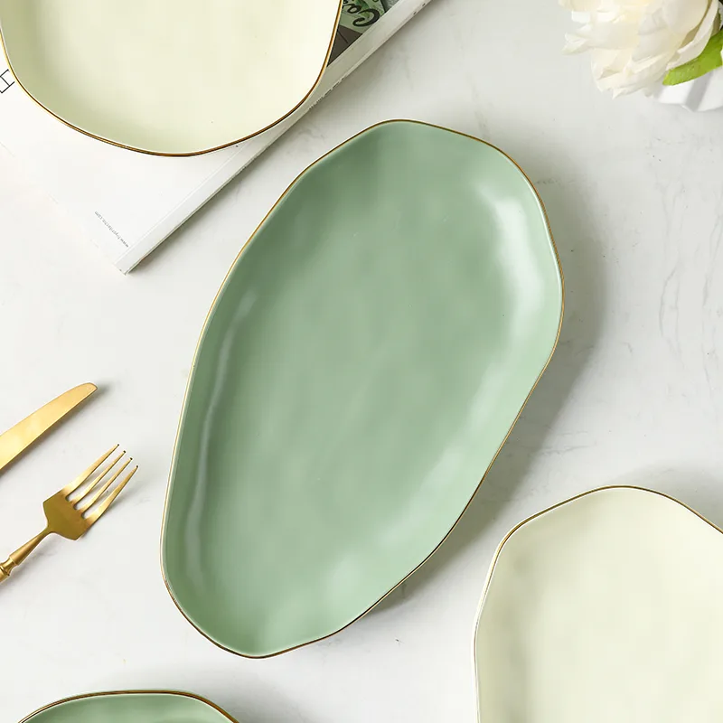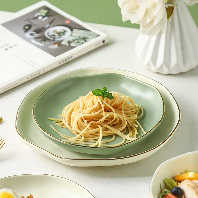 Elevate your dining experience with our exquisite ceramic dinnerware collection. Crafted with precision and passion, each piece is fired at a high temperature of 1260°C, resulting in the finest porcelain that boasts both durability and beauty. Embracing an alluring irregular shape, every item in this collection is a unique work of art, accentuated by captivating color-glazing techniques. The hand-painted gold rim adds a touch of opulence, while the matt color finish exudes understated elegance. Indulge in the luxury of exceptional dining with our meticulously designed ceramic dinnerware, where every meal becomes a cherished moment.