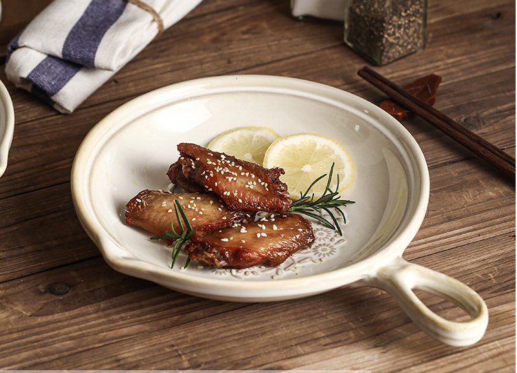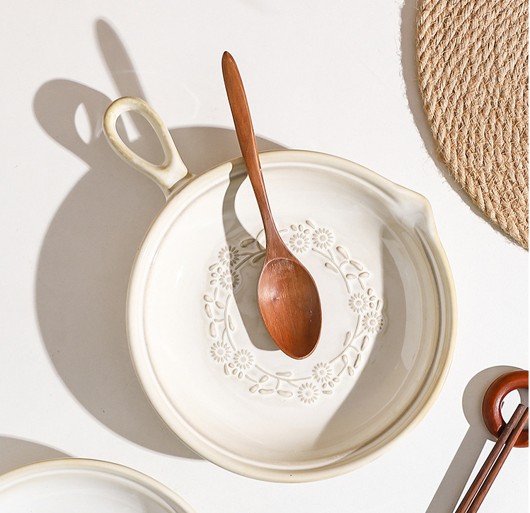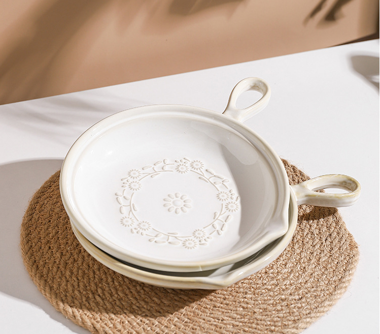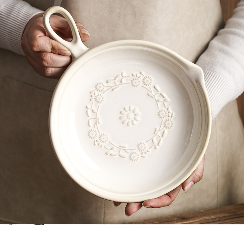 Introducing our exquisite ceramic bakeware with a single ergonomic handle, designed to elevate your culinary experience. The intricate relief pattern adds a touch of elegance, while the stunning fambe glaze enhances both aesthetics and durability. This versatile bakeware is your all-in-one solution – safe for use in the microwave, oven, and dishwasher. Elevate your kitchenware collection with this functional and beautiful piece.